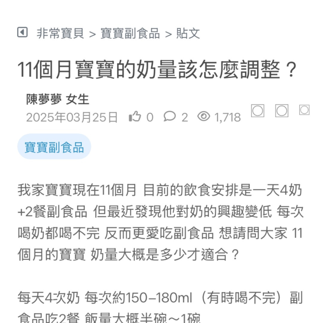 我家寶寶現在11個月 目前的飲食安排是一天4奶+2餐副食品 但最近發現他對奶的興趣變低 每次喝奶都喝不完 反而更愛吃副食品 想請問大家 11個月的寶寶 奶量大概是多少才適合?