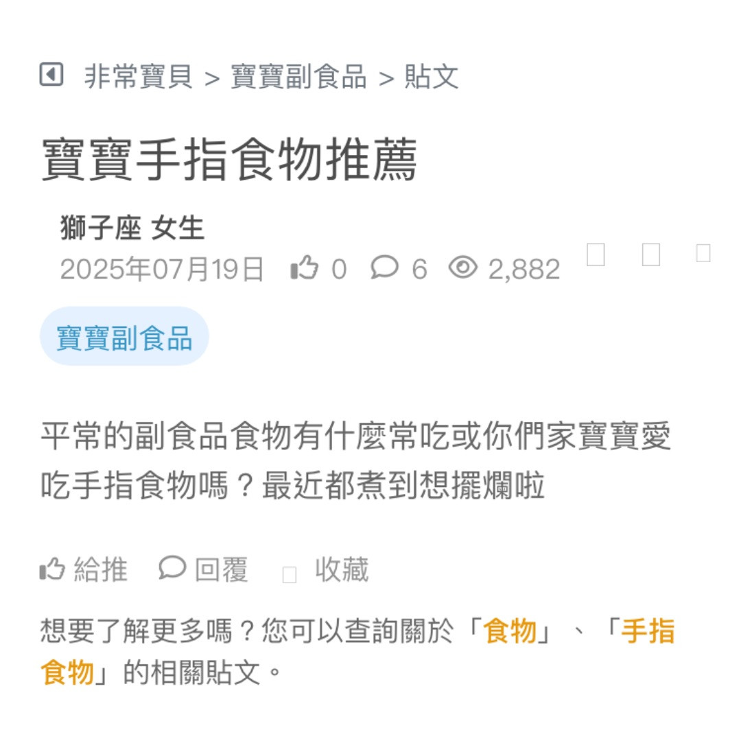 我廚藝爛爆 老公也嫌棄那種 無法下廚煮 好羨慕別人媽咪會做好吃的手指食物 4m副食品亂試了一堆泥之後 到了快6m想給寶寶吃手指食物 請問有什麼外面市售買的到寶...
