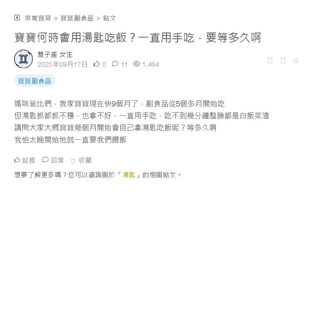 我家寶寶現在快要滿8個月,最近開始對吃飯這件事非常有興趣,手會一直想搶湯匙🤣 想開始訓練她自己使用學習餐具 有看過那種矽膠湯匙、彎彎的叉子、還有防滑吸盤碗什麼的,大家有沒有推薦寶寶初學用起來順手、又安全好清洗的學習餐具?有推薦的品牌嗎~ 看更多