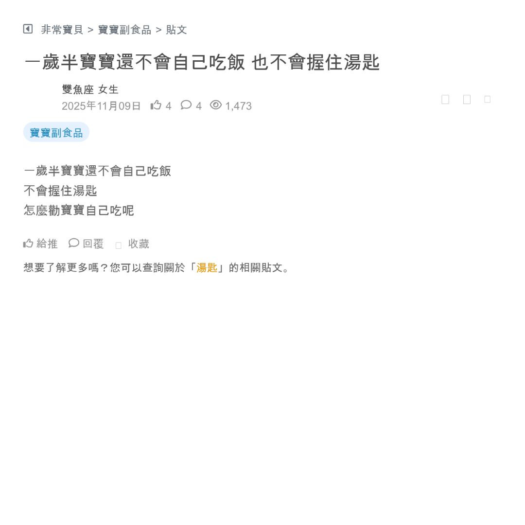 有人的寶寶也是這樣嗎 寶寶11個月都還沒開始吃副食品 完全不吃副食品 😭 只喝奶 寶寶粥、水果泥、蔬菜泥等什麼方法都用過了 試到現在寶寶都快滿周歲還...