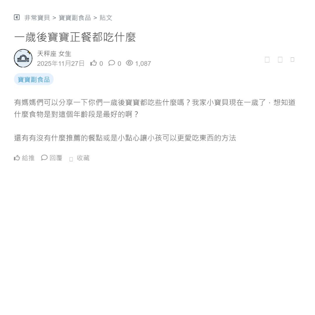 我家寶寶剛滿一歲 三餐正餐+早晚奶超燒腦 很需要參考大家的經驗 誰有寶寶一歲的食譜或一週準備的食物可以分享一下嗎? 看更多