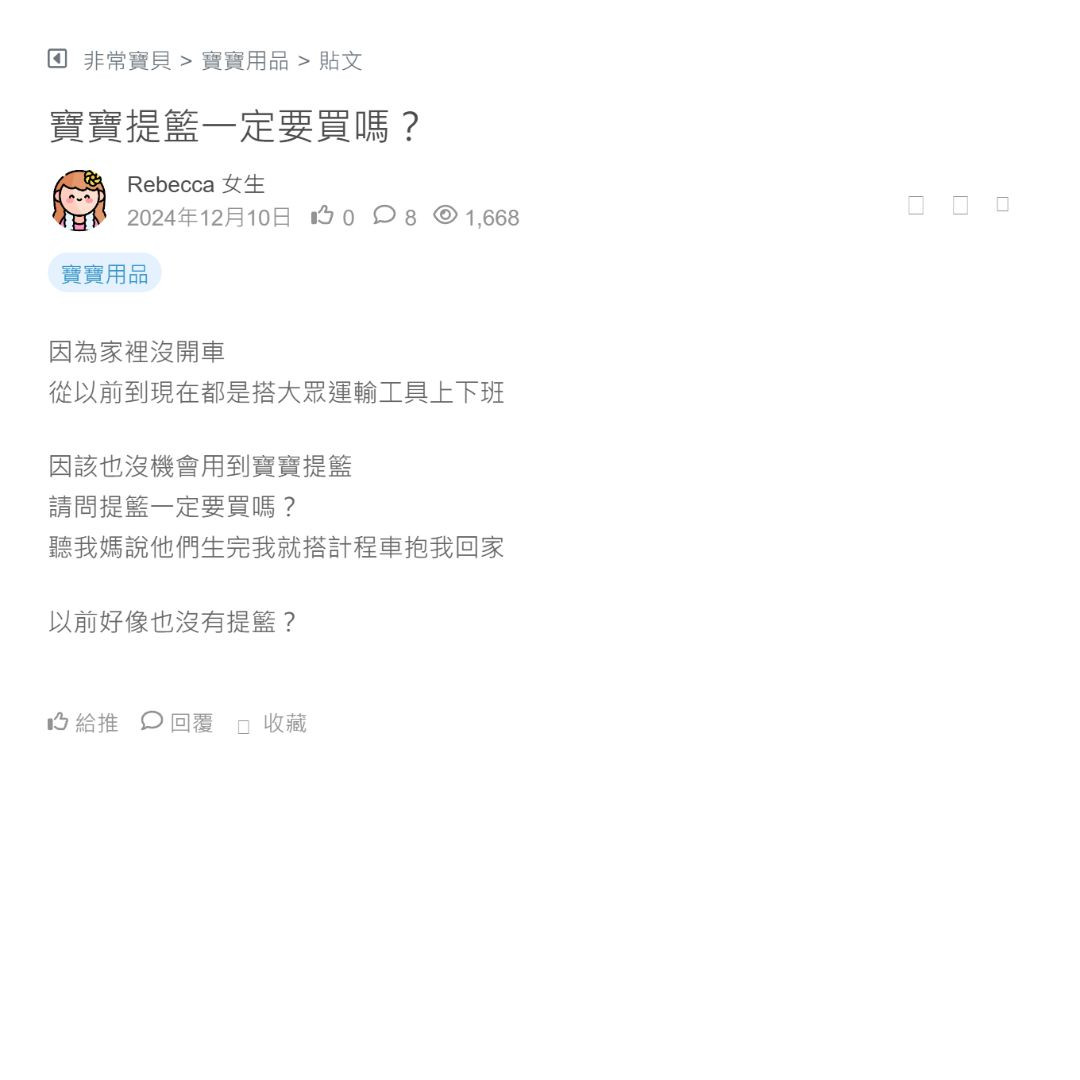 不能不買啦,我住士林也沒開車、騎車,得知懷孕三個月後就跟先生去買了新生兒提籃,同時也是安全座椅喔,為了你們寶寶的安全一定也要買提籃的