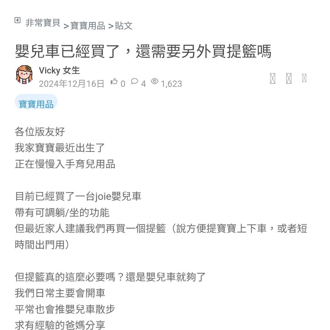 但最近家人建議我們再買一個提籃(說方便提寶寶上下車,或者短時間出門用)