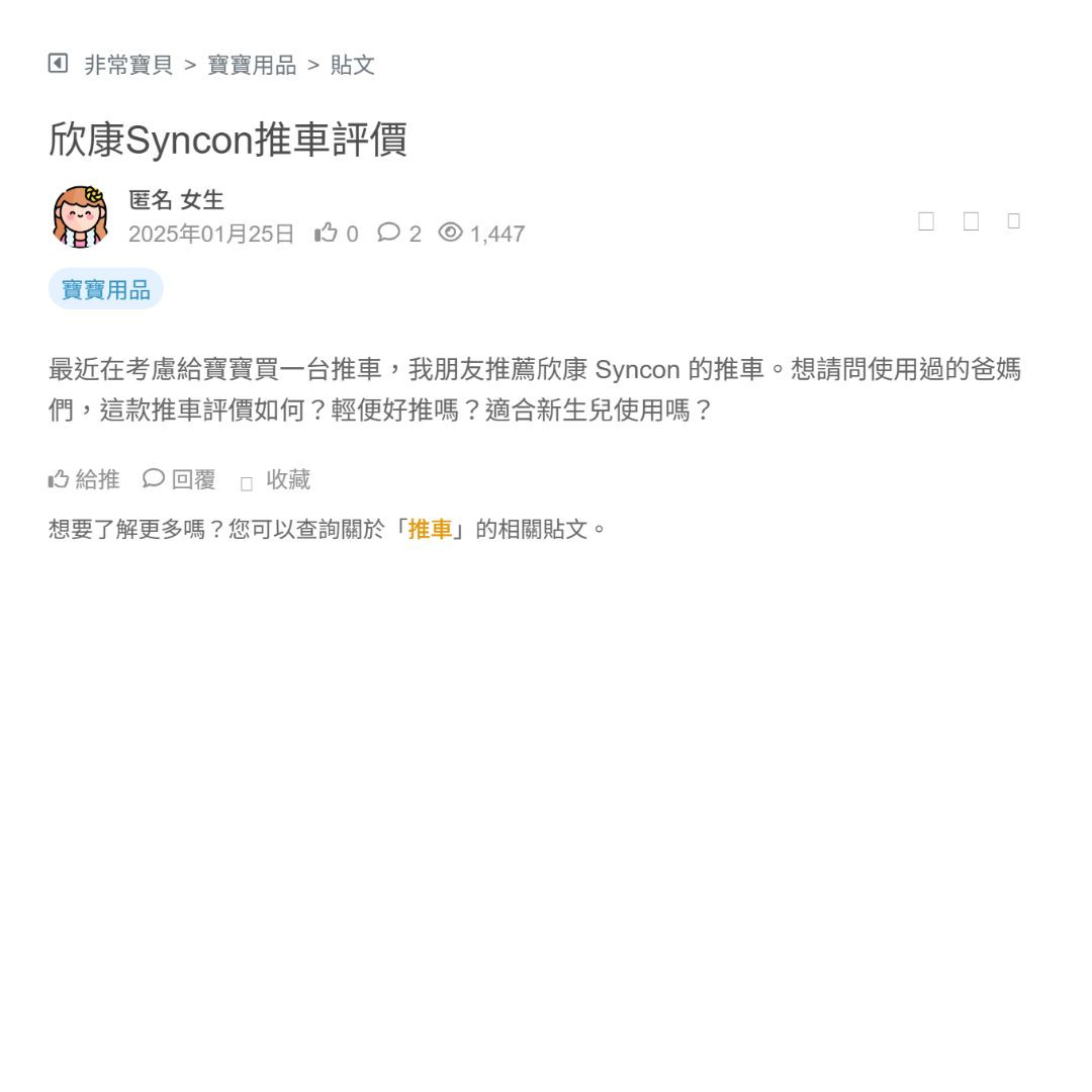 最近在考慮給寶寶買一台推車,我朋友推薦欣康 Syncon 的推車。想請問使用過的爸媽們,這款推車評價如何?輕便好推嗎?適合新生兒使用嗎?