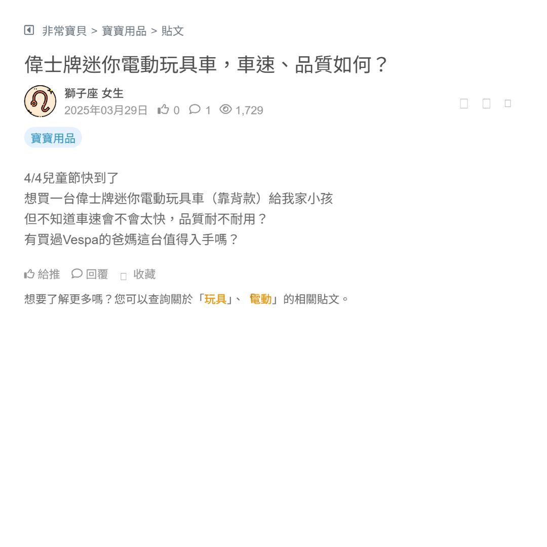 想買一台偉士牌迷你電動玩具車(靠背款)給我家小孩