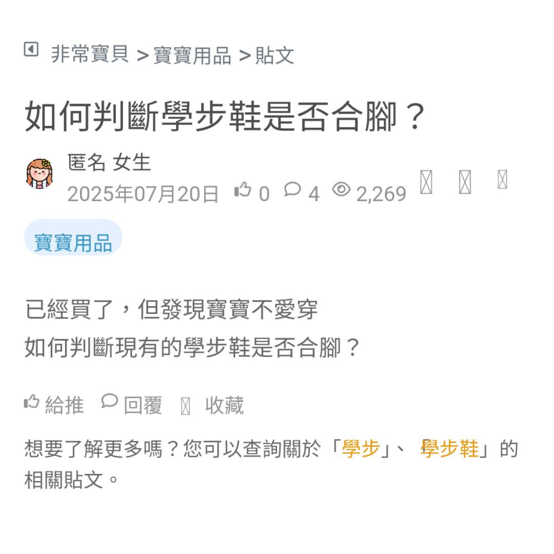 我家那隻也是買了學步鞋之後很抗拒,後來檢查才發現原來鞋內部有些線頭刺腳