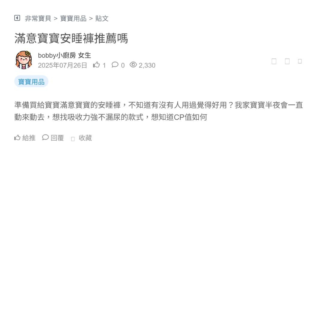 準備買給寶寶滿意寶寶的安睡褲,不知道有沒有人用過覺得好用?我家寶寶半夜會一直動來動去,想找吸收力強不漏尿的款式,想知道CP值如何
