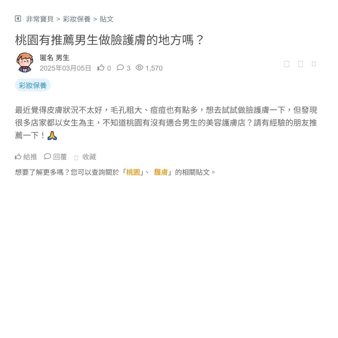 最近覺得皮膚狀況不太好,毛孔粗大、痘痘也有點多,想去試試做臉護膚一下,但發現很多店家都以女生為主,不知道桃園有沒有適合男生的美容護膚店?請有經驗的朋友推薦一下!🙏
