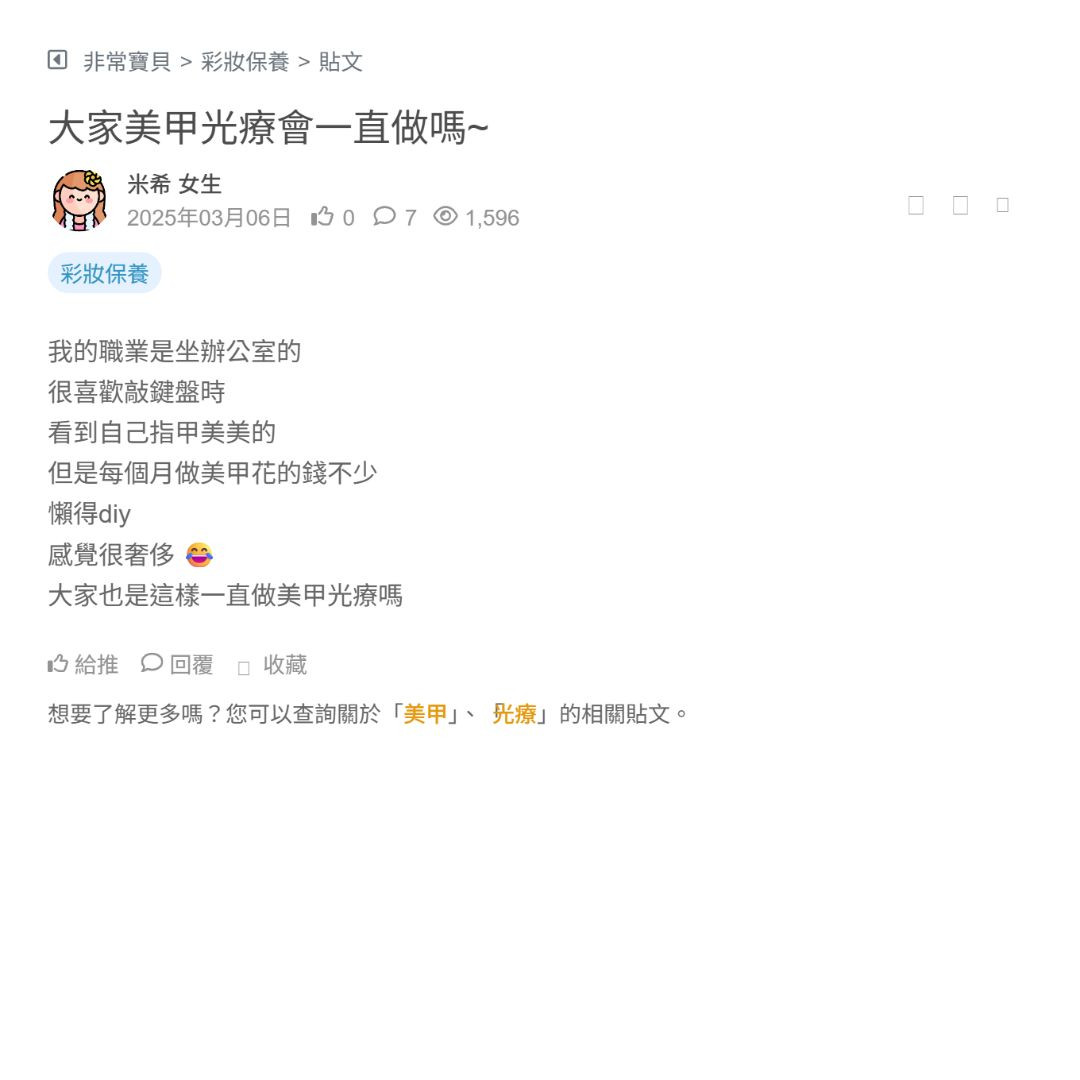 最近發現法式美甲超貴 想問法式美甲跟一般光療的區別 只有外緣的比例有差嗎? 感覺兩個差不多.. 看更多