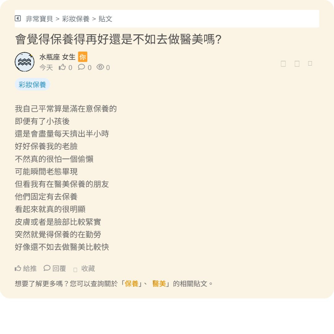 想去打看看玻尿酸 聽說可以減少法令紋、嘴角下垂、皺紋耶! 生完小孩真的需要醫美 反正可以讓皮膚變平滑 變年輕貌美 可是我還沒有勇氣 怕有副作用 然後效果怎麼樣 會痛嗎⋯⋯ 求去過的醫美診所的各位帥哥美女解答 並期待有一個耐心專業的醫生 可以幫幫我 看更多