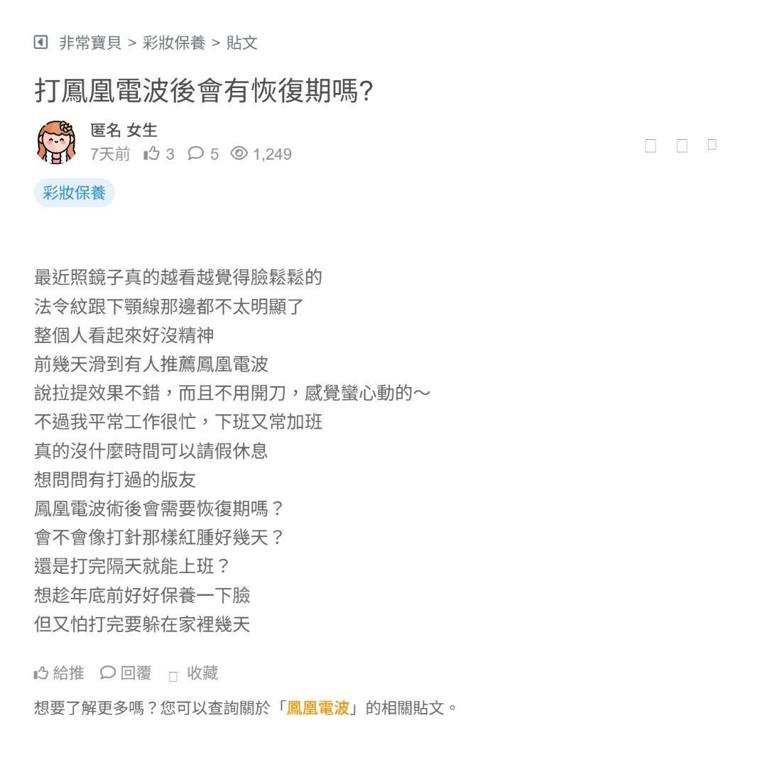 最近真的有點心動想去打鳳凰電波 覺得臉鬆鬆的、法令紋也越來越明顯 上班開視訊會議看著自己都快崩潰了 上網查了一堆資料,發現價差好大 還有人說機台、探頭、醫...