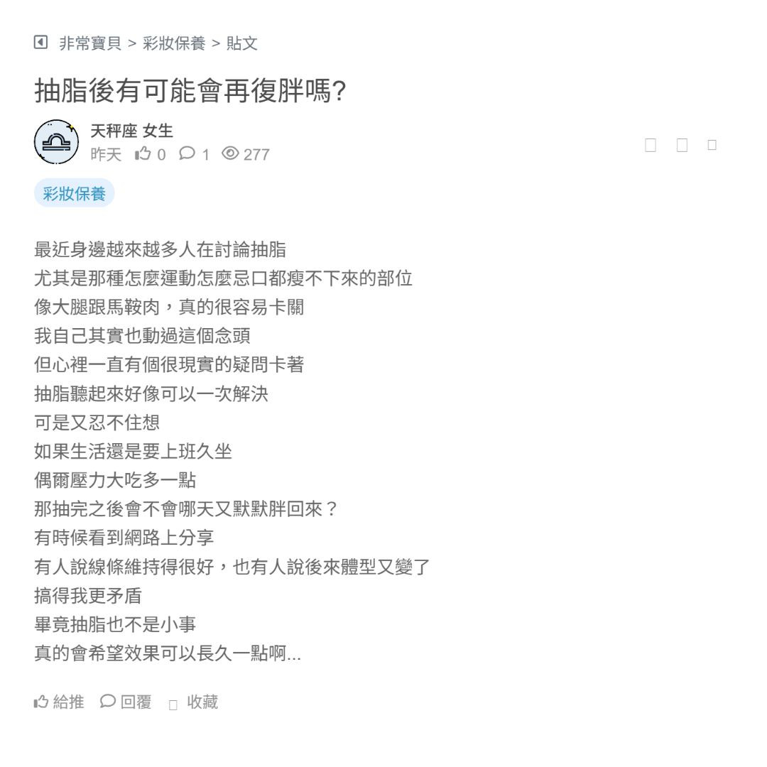 近期在網路上看到一個叫做冷凍減脂的東西,減掉體脂就靠這個~感覺很神奇啊! 這個需要做好幾次才看得到明顯效果嗎?有人試過嗎,效果真的有用? 會痛嗎?還是有其他副作用?現在好多人都在推,不知道要不要去試試看,大家有什麼推薦或踩雷的經驗希望美女們可以分享,想參考一下,感謝🥹 看更多