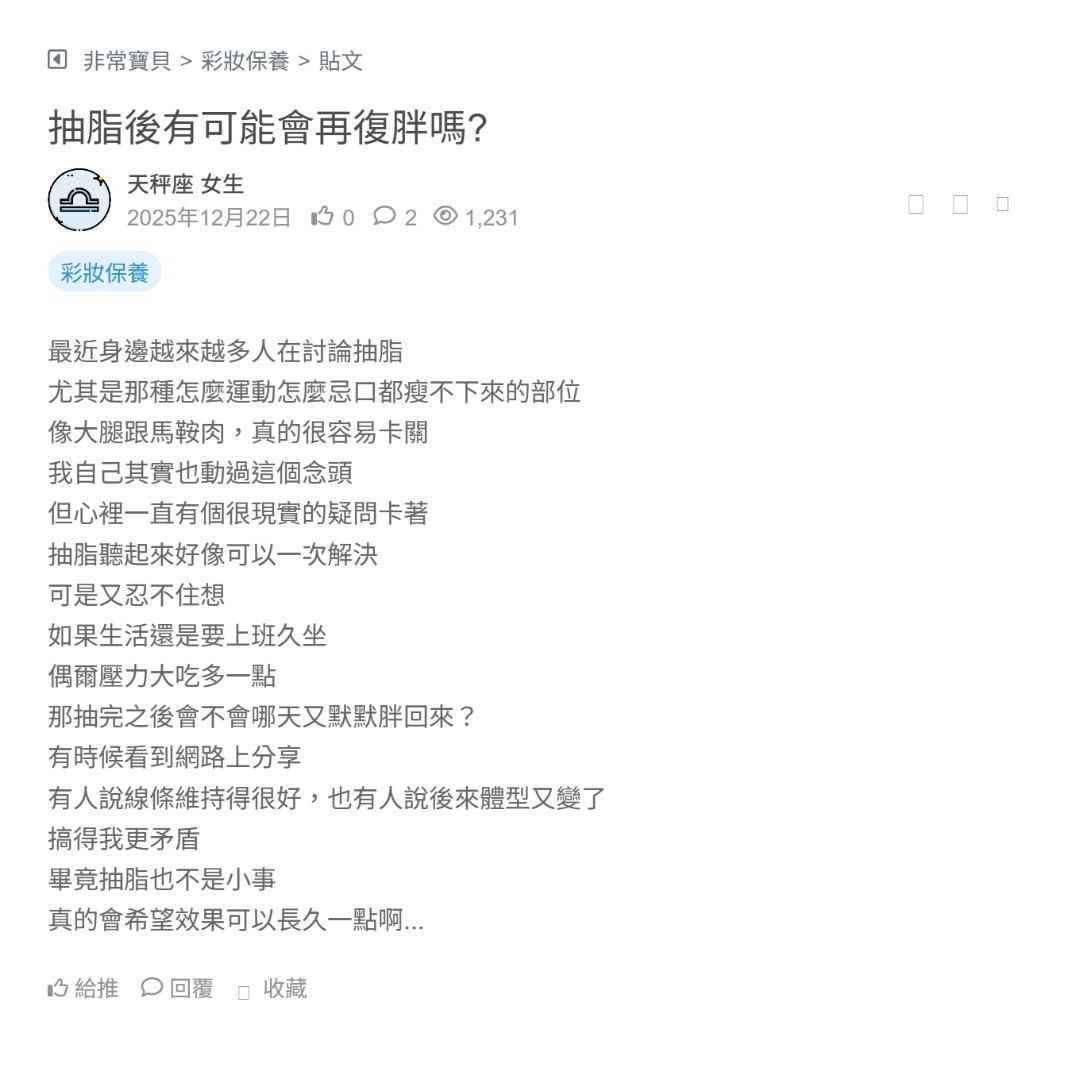 最近一直在考慮抽脂的事 主要是某些地方真的怎麼運動 飲控都瘦不太下來 看著鏡子裡的自己其實有點沮喪 但每次想到手術兩個字 腦中第一個浮現的就是傷口 老實說我蠻怕看到很大的疤,也很擔心恢復期 上網查了一下 有人說現在很多都是小傷口、隱痕位置 但也有人分享照片看起來還是有點嚇人 讓我更猶豫 畢竟生活還是要照常上班... 看更多