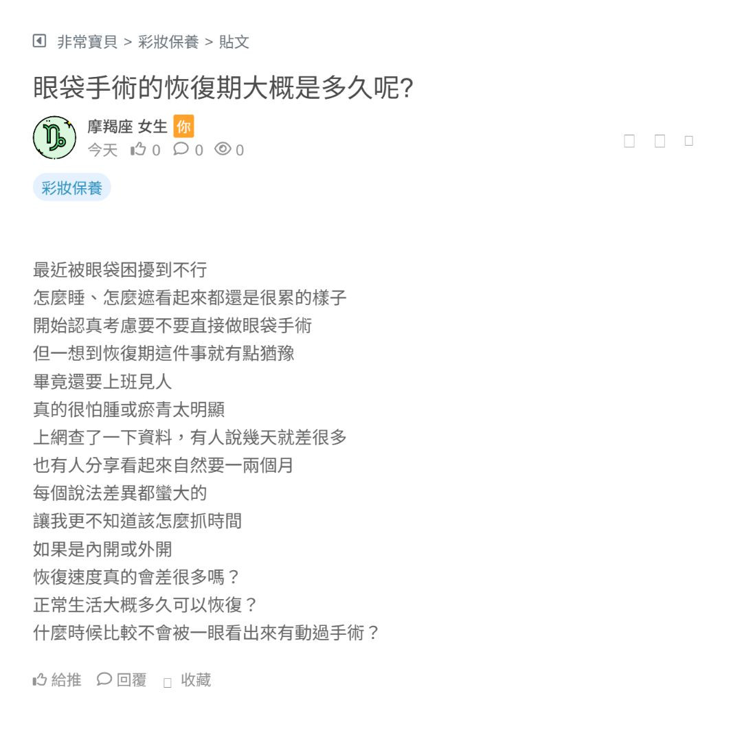 我的天生眼袋比較明顯 高中就有很深的眼袋了... 之前疫情戴口罩 眼袋根本吵明顯 😭 起來疲憊又顯老 一直沒有去問內開眼袋手術 最近在考慮趁轉職的時候找台北新北的醫美 但上網看術後可能有腫脹問題、眼球上吊後遺症 如果失敗了感覺很慘 有做過內開眼袋手術的人可以分享一下 術後恢復情況如何 失敗率高不高... 看更多