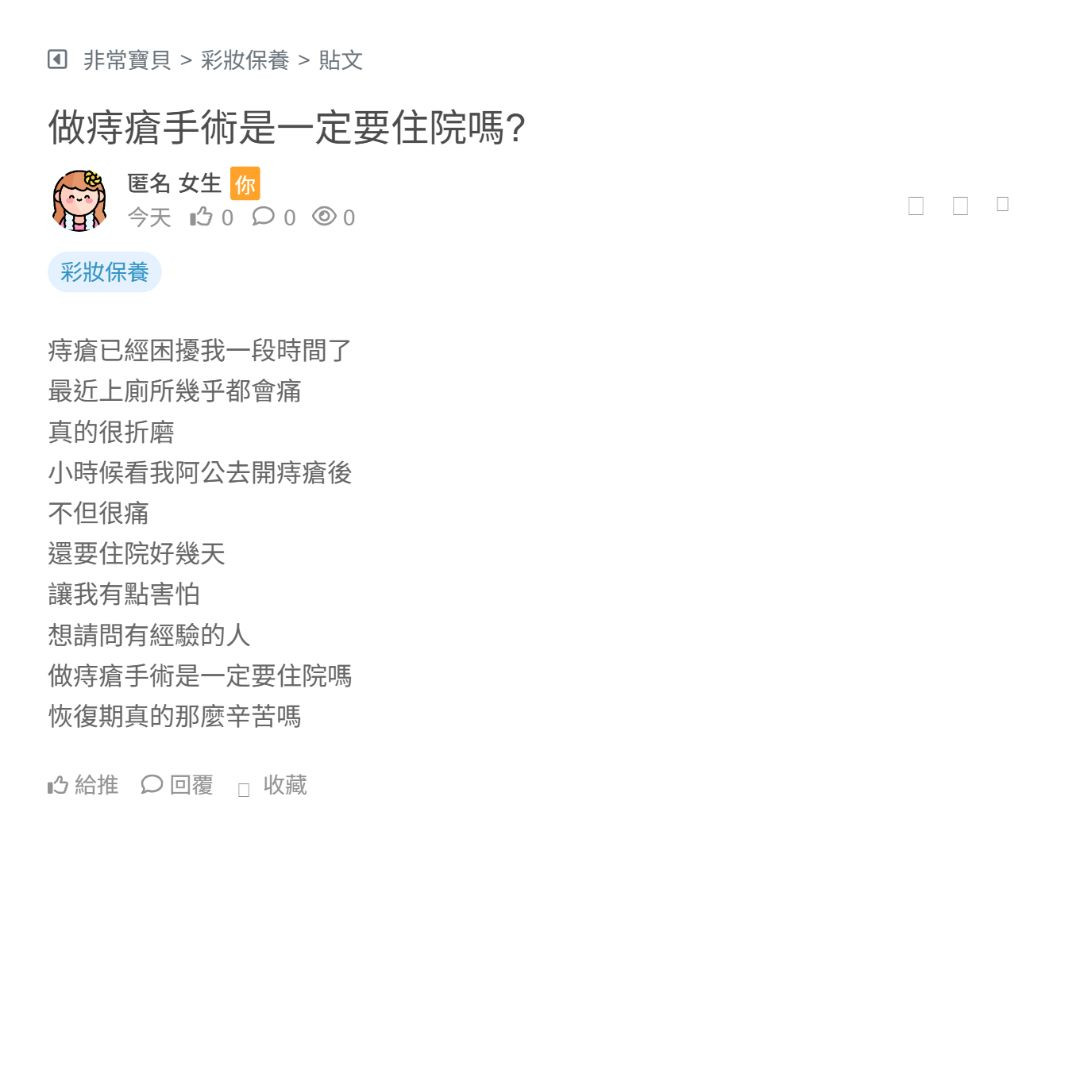 我媽她其實已經被痔瘡 困擾一段時間了 只是一直很害怕動手術 聽說術後會蠻痛的 看完之後其實會有點替她擔心 另外我也有點在意 就是不知道 之後會不會又容易復發 畢竟誰也不想反覆受罪 想請問有經驗的人實際狀況 讓我們可以多一點參考 看更多