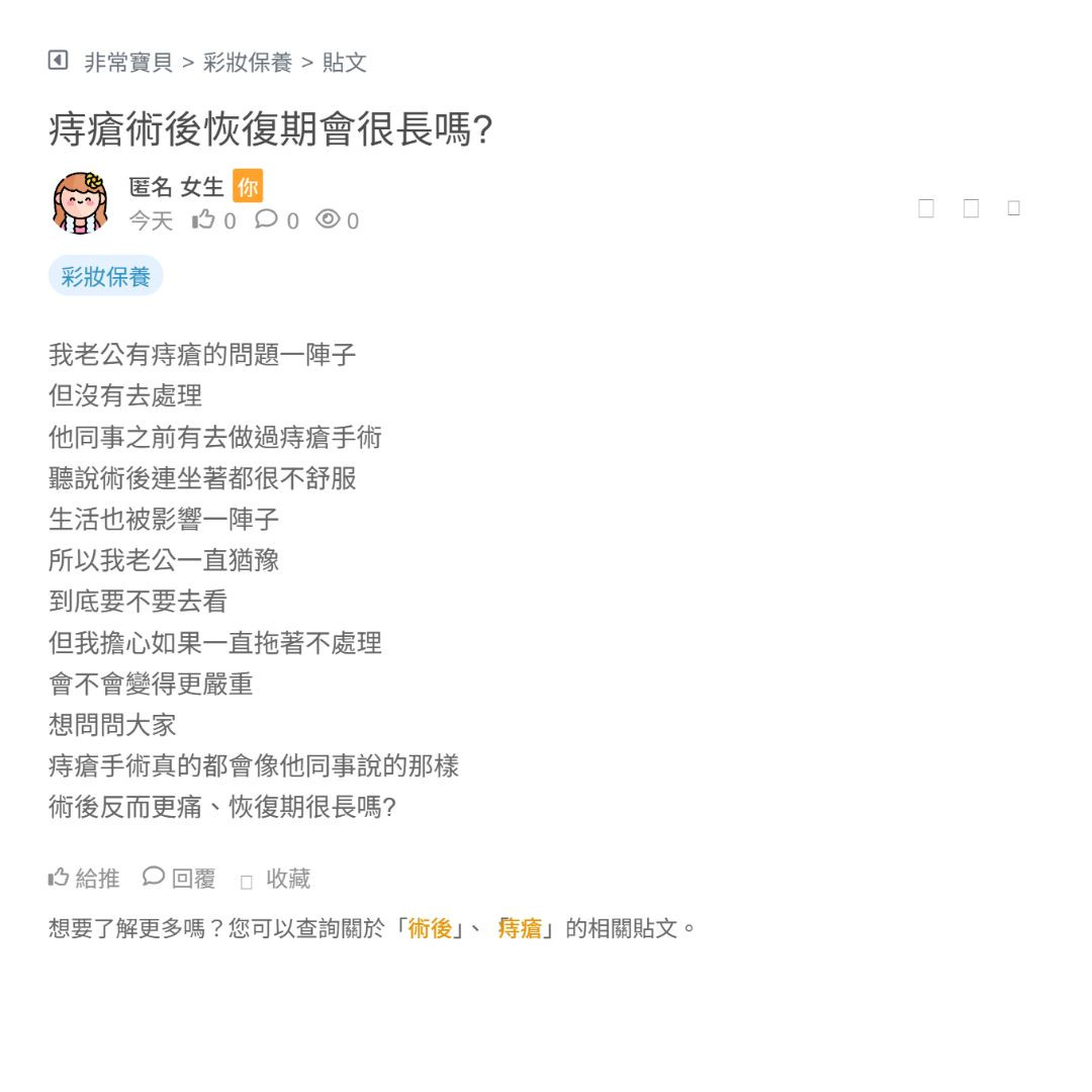我媽她其實已經被痔瘡 困擾一段時間了 只是一直很害怕動手術 聽說術後會蠻痛的 看完之後其實會有點替她擔心 另外我也有點在意 就是不知道 之後會不會又容易復發...