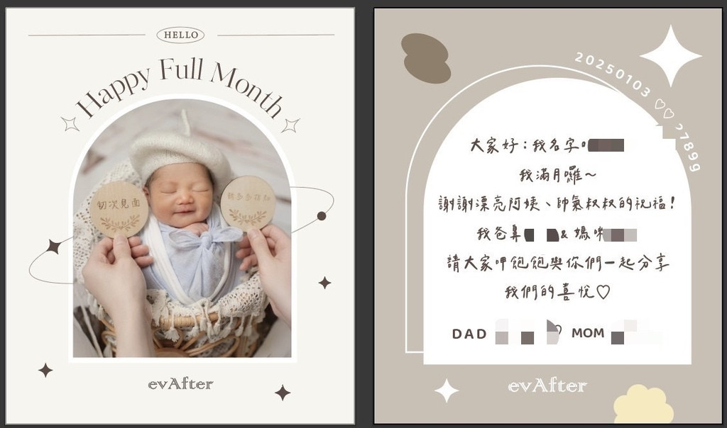 evAfter 提供設計精美的卡片,可以印上寶寶的名字、照片...等資訊