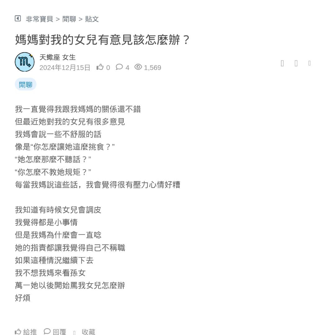 我是新手媽媽,寶寶才三個月大,結果婆婆每天都來指導(其實講難聽一點是糾正)我育兒方式。 從餵奶時間、抱小孩的方式、甚至連衣服怎麼穿都要管。每天聽她說「...