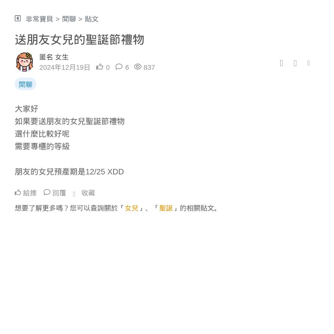 聖誕節快到了~~~ 我朋友已經在揪交換禮物團了 想知道大家想收到什麼聖誕禮物 1000元以內的喔 我想去買給我朋友~~ 謝謝大家❤️❤️❤️ 看更多