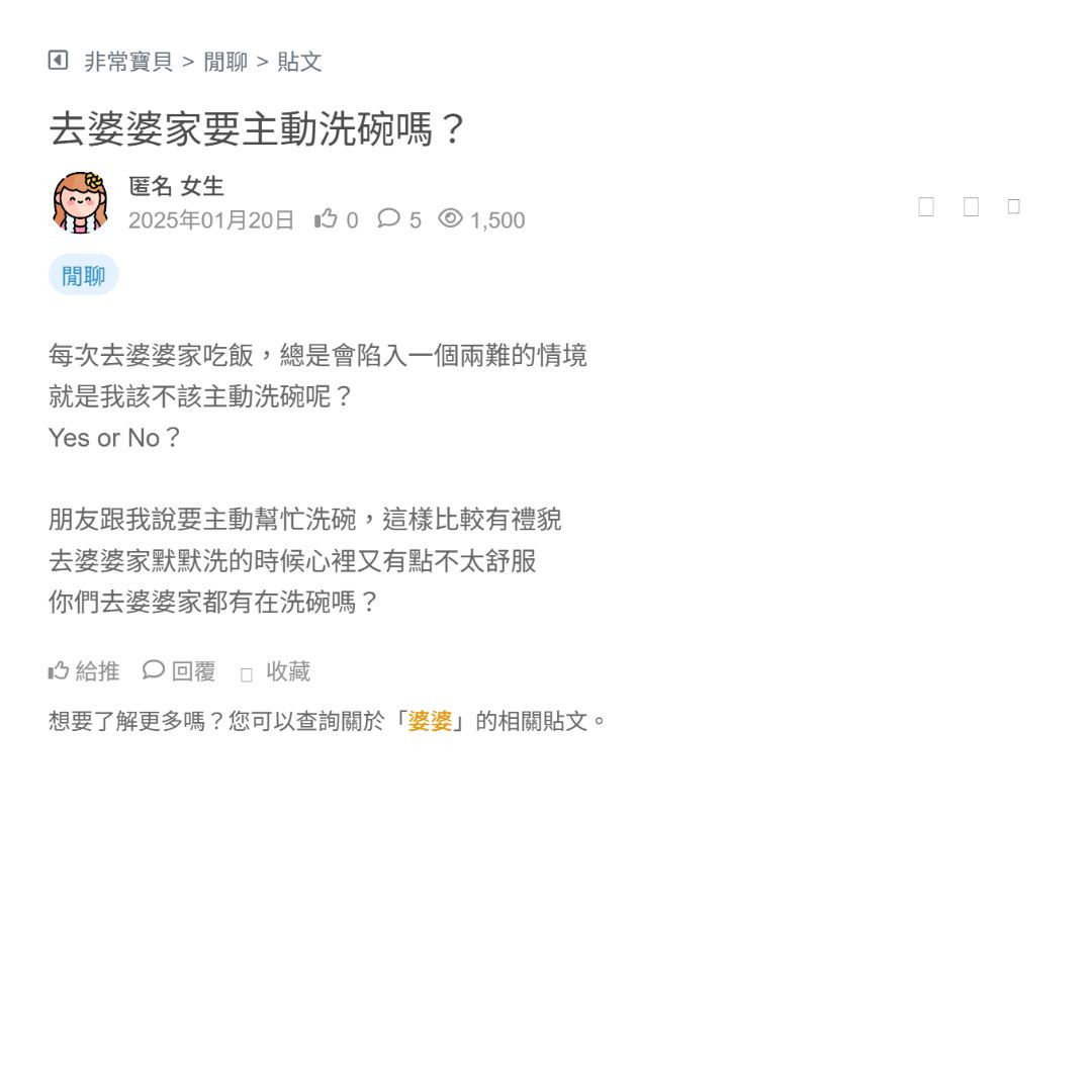 一直以來和老公都是在外頭租屋的 去年生了兒子後 婆婆說嘉義的房子給我們住 我和老公確實省了一筆錢 但是老公變成要時常往返台南上班 婆婆因為住附近 常常跑了看兒子 我受不了的地方是 她喜歡跑了玩孫子 都不幫忙就算了 還幫倒忙 怪東怪西的 趁老公不在家 然後碎碎唸說都借房子給你們住了 X 很了不起嗎 我生兒子又不是為... 看更多
