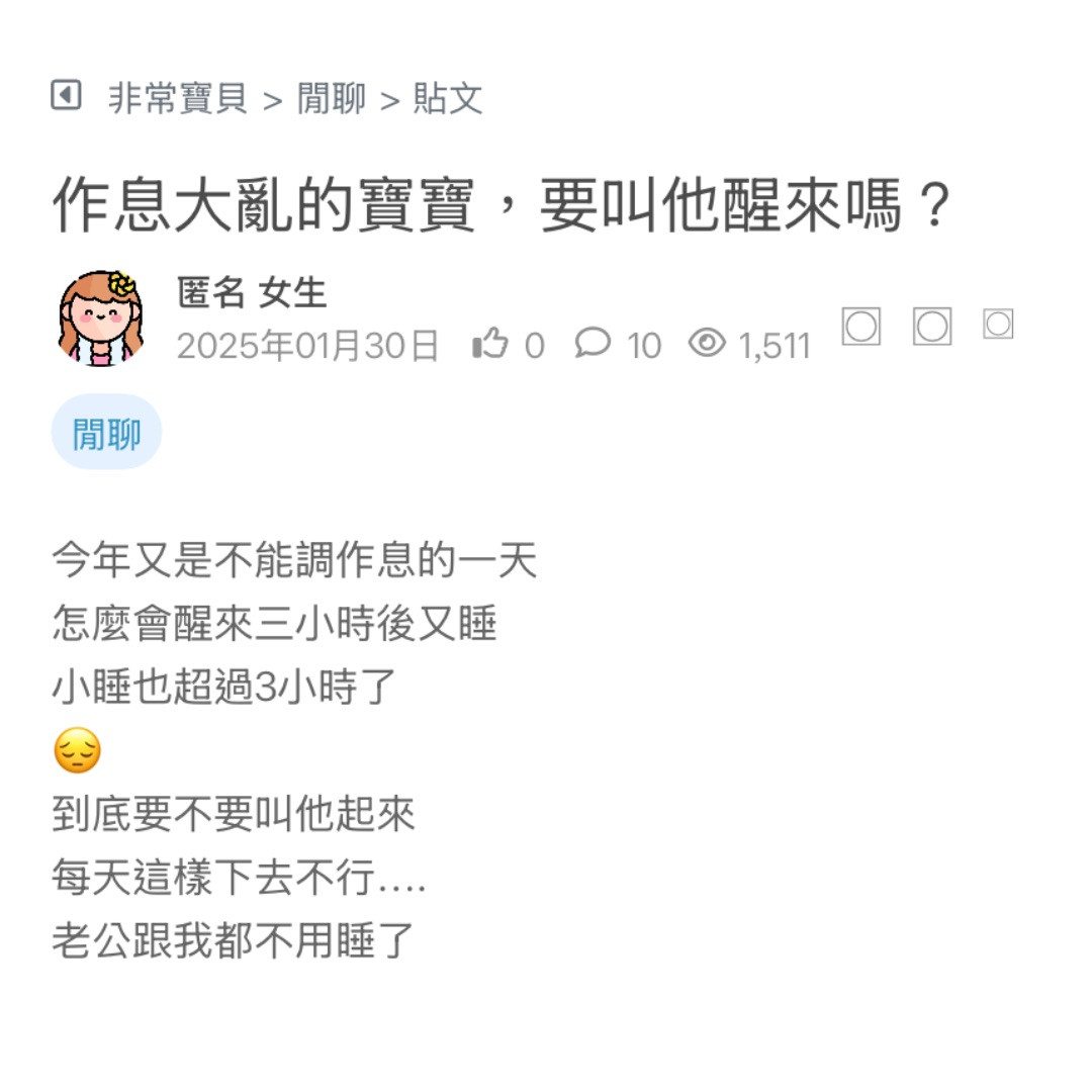想問各位媽媽一天能睡多久?一整天都好忙,寶寶哄睡+哭鬧根本不能入睡 還有家務、工作,每天都覺得時間不夠用!不曉得大家都怎麼湊睡眠時間呢? 我自己平...
