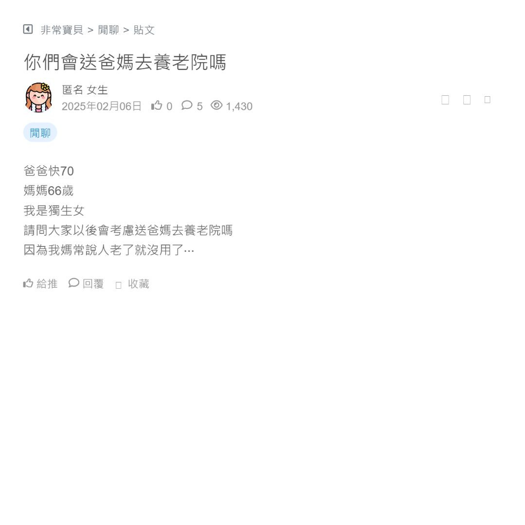 最近一直在想一個問題,獨生子女沒有兄弟姐妹幫忙,未來要怎麼一個人照顧年邁的爸媽?這幾年看爸媽年紀漸長,身邊沒有人可以分擔照顧責任,感覺有股無形的壓力 有想過要請看護或是住老人安養中心,心裡還是會覺得愧疚,畢竟爸媽那麼辛苦養我長大,想盡力陪伴他們走過最後一段路 想知道大家都是怎麼解決這個問題?有什... 看更多