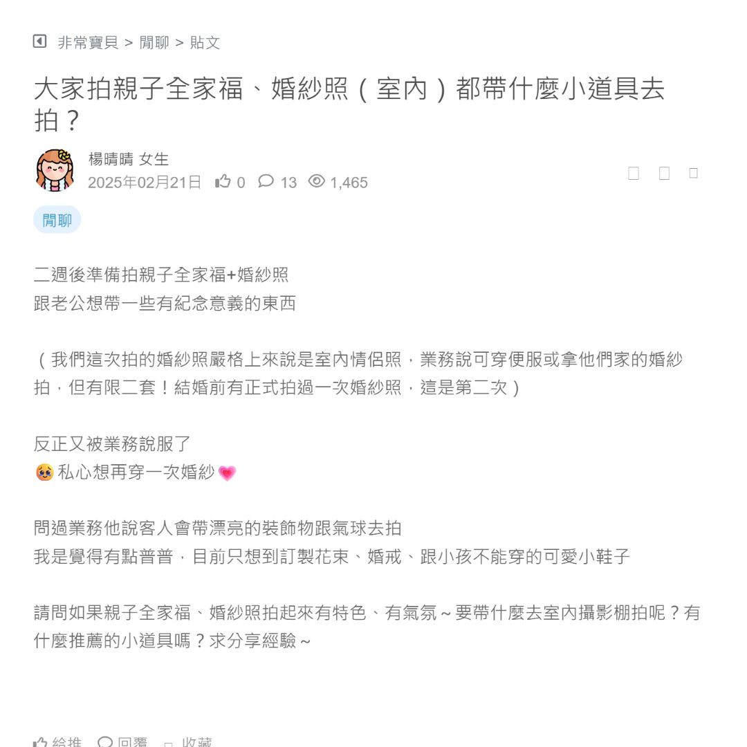 當初拍婚紗照不會像原po 那麼麻煩欸,我們的攝影棚有報紙、跟娃娃跟一些小道具,留給新人拍照用,不用特別準備,覺得超方便!