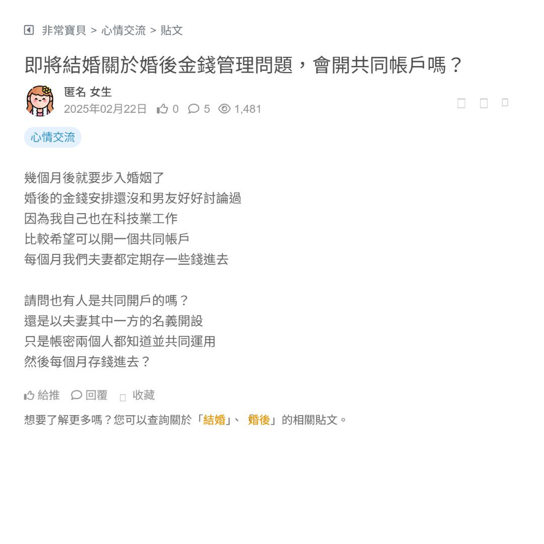 即將結婚關於婚後金錢管理問題,會開共同帳戶嗎?