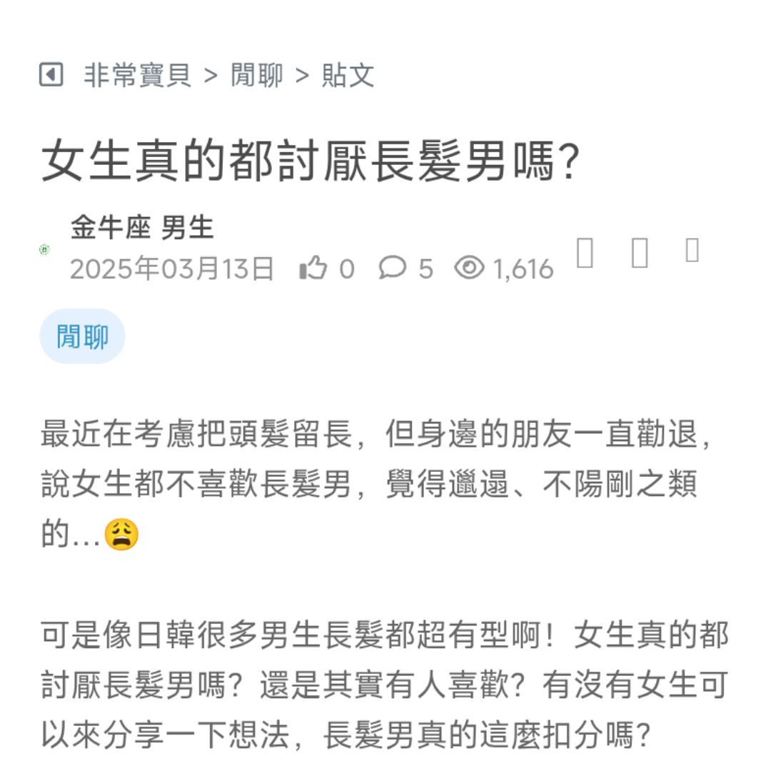最近在考慮把頭髮留長,但身邊的朋友一直勸退,說女生都不喜歡長髮男,覺得邋遢、不陽剛之類的…😩