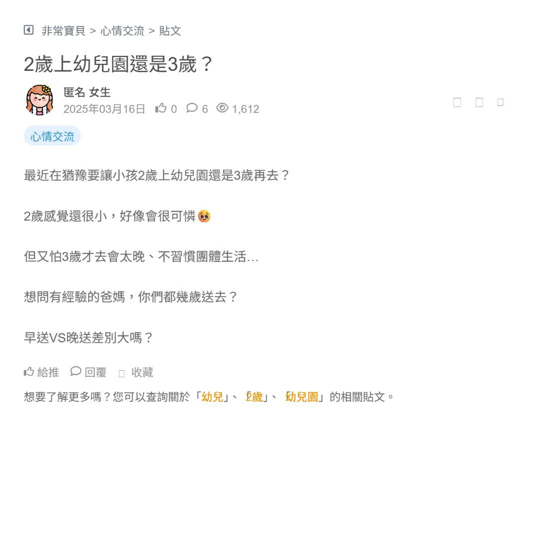 女兒快2歲了 一直很捨不得送小孩去上幼兒園 全台各地太多虐童案發生 前幾天新聞又看到安親班甚至也有老師傷害小孩的案例 好擔憂小孩以後入學狀況 怎麼避免找到會虐童的幼兒園老師? 現在的幼兒園虐童案真的越來越多 帶著假面具 跟家長溝通貌似親切又好相處 一轉身就去虐待小孩 太可怕😟 看更多