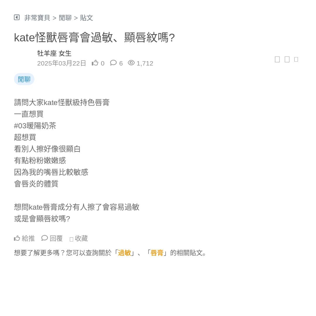 之前擦某專櫃大品牌的唇套產品,櫃姐介紹都超好用 但沒想到回家試用,唇膏上唇後一直有說不出的阿嬤味的怪味,不然有些就是濃厚的香精香料味 我最怕吃起來有種...