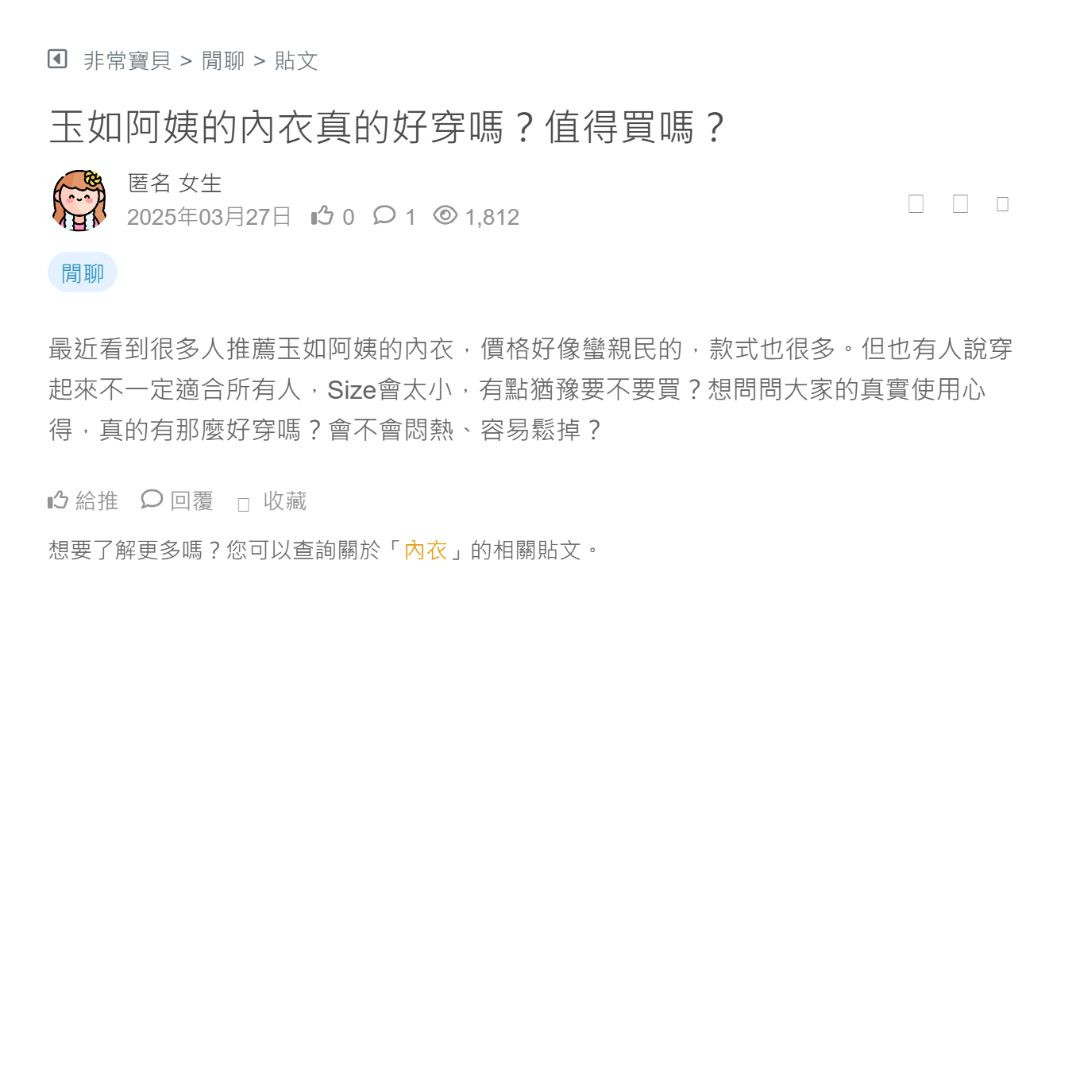 最近看到很多人推薦玉如阿姨的內衣,價格好像蠻親民的,款式也很多。但也有人說穿起來不一定適合所有人,Size會太小,有點猶豫要不要買?想問問大家的真實使用心得,真的有那麼好穿嗎?會不會悶熱、容易鬆掉?