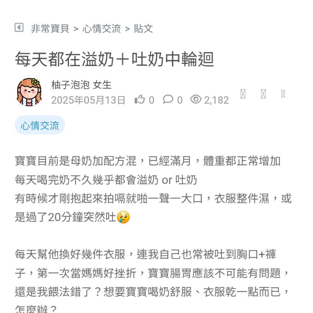 我家寶寶現在快2個月,幾乎都是親餵,但他很容易溢奶或吐奶 有時候吃完奶抱直一陣子,還是會從嘴角流出來😩 但看他吐完又沒不舒服,還是照常笑、繼續玩 親餵...