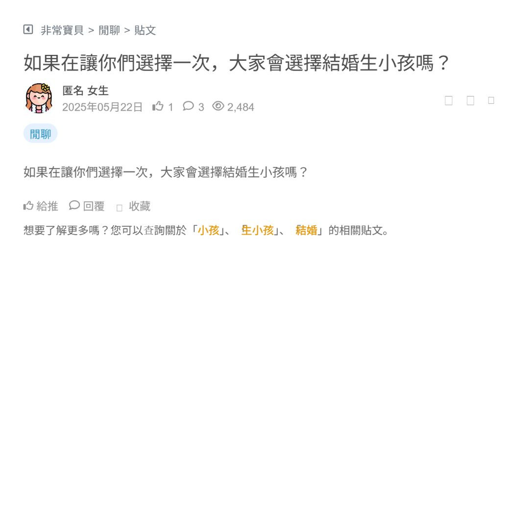 我今年31歲 是在職場多年的單身女性 目前也沒有喜歡的人也沒有別人喜歡我 跟我同年紀的女性好友她們不想生 原因是有些人單身找不到另一半 有些人穩定交往...