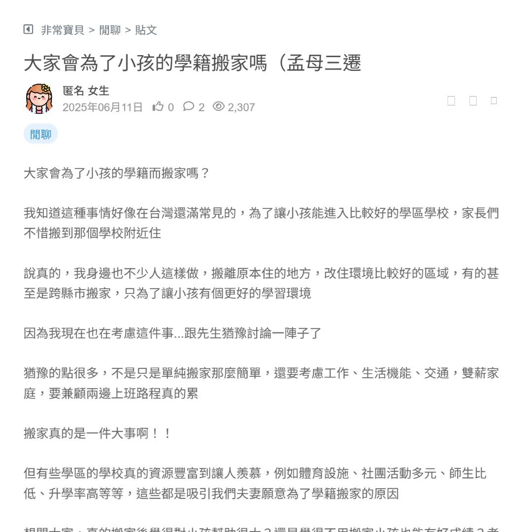 大家會為了小孩的學籍搬家嗎(孟母三遷