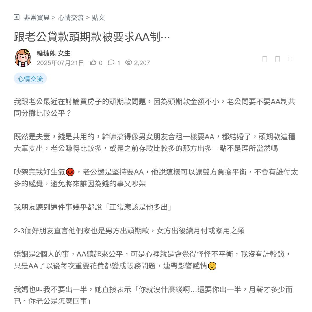 既然是夫妻,錢是共用的,幹嘛搞得像男女朋友合租一樣要AA,都結婚了,頭期款這種大筆支出,老公賺得比較多,或是之前存款比較多的那方出多一點不是理所當然嗎