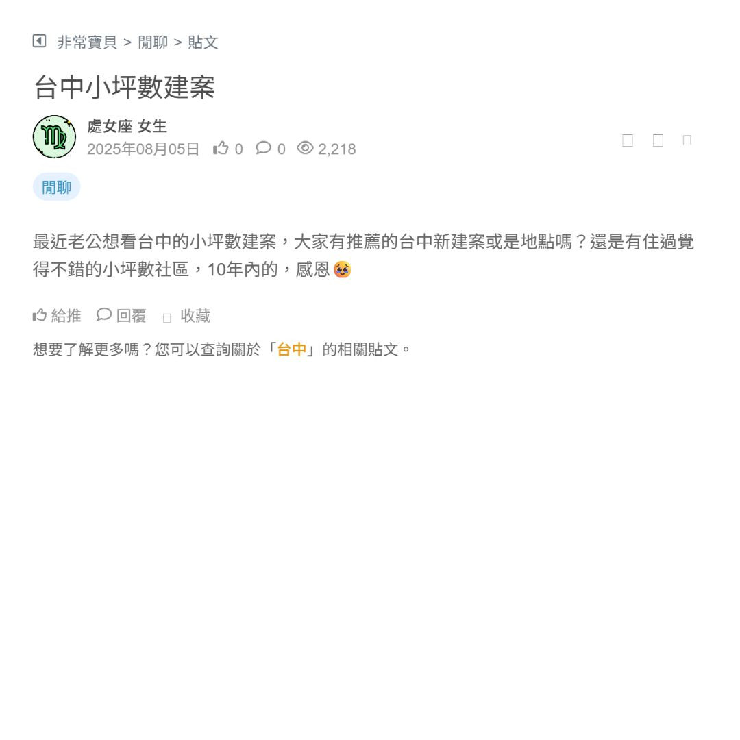最近老公想看台中的小坪數建案,大家有推薦的台中新建案或是地點嗎?還是有住過覺得不錯的小坪數社區,10年內的,感恩🥹
