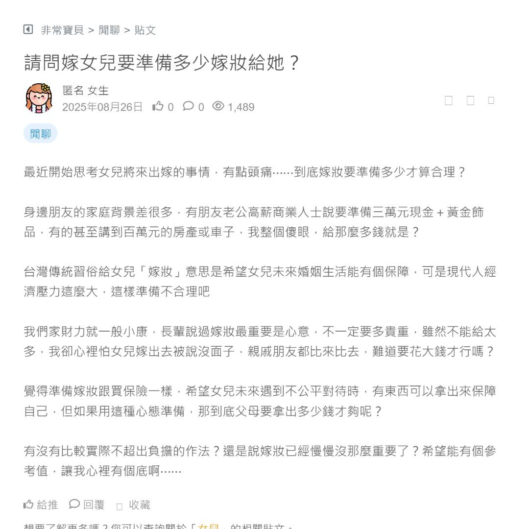 最近開始思考女兒將來出嫁的事情,有點頭痛⋯⋯到底嫁妝要準備多少才算合理?