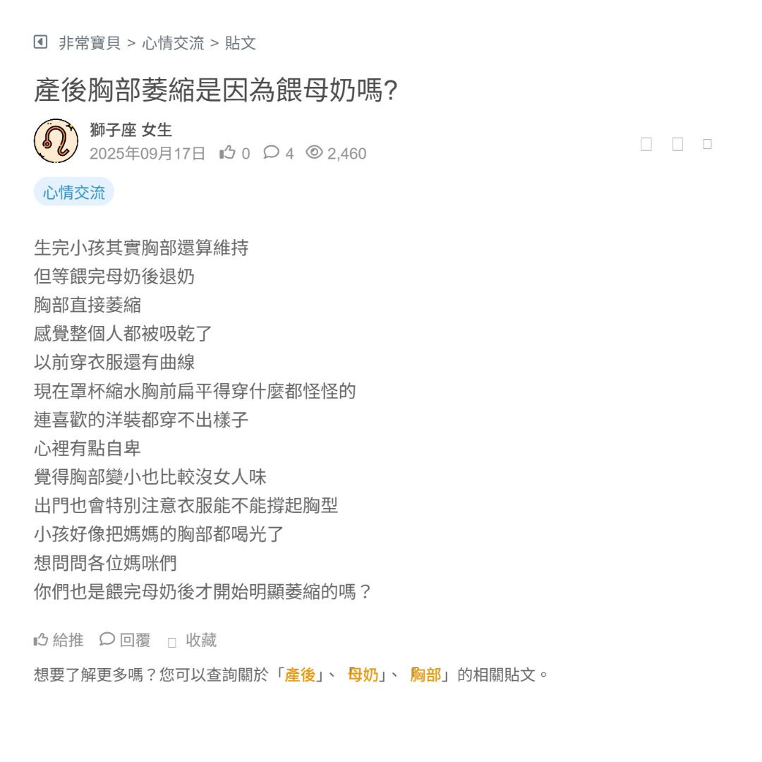 嗚!! 我以前的胸部還算有份量 結果生完小孩後怎麼就這麼平啊😭 有媽咪跟我一樣的困擾嗎? 感覺老公都默默在嫌棄,我自己也覺得有點難過... 大家有推薦該...