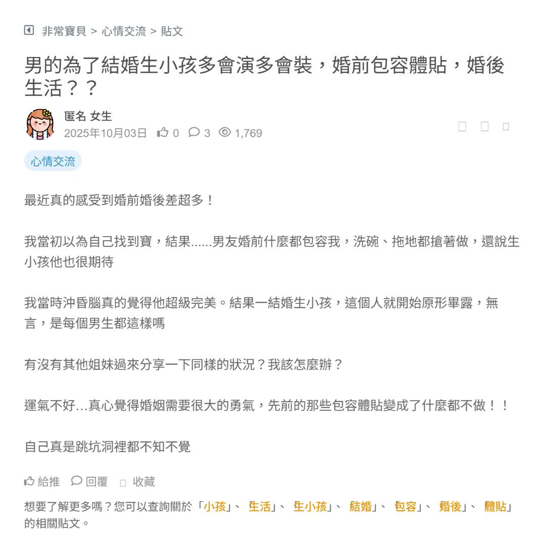 我當時沖昏腦真的覺得他超級完美。結果一結婚生小孩,這個人就開始原形畢露,無言,是每個男生都這樣嗎