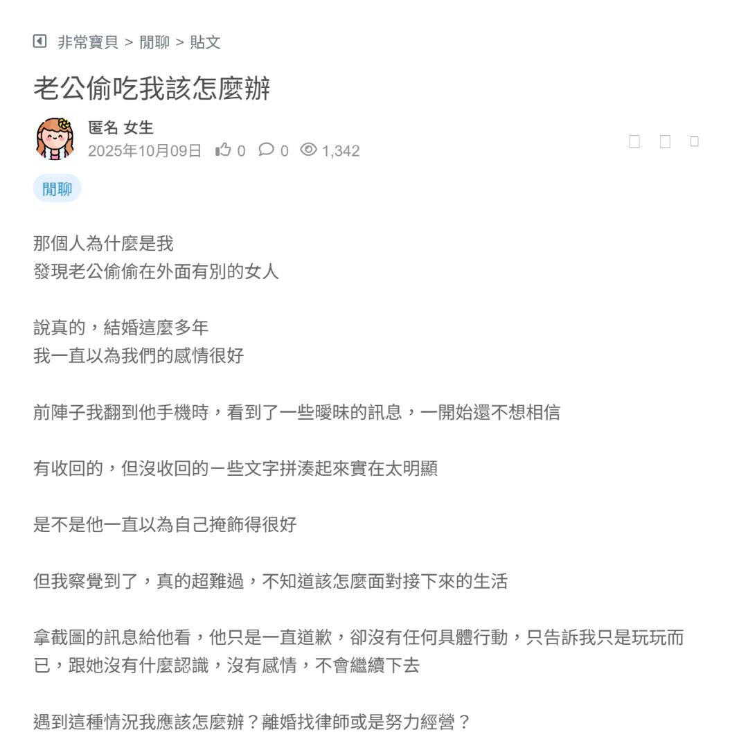 前陣子我翻到他手機時,看到了一些曖昧的訊息,一開始還不想相信