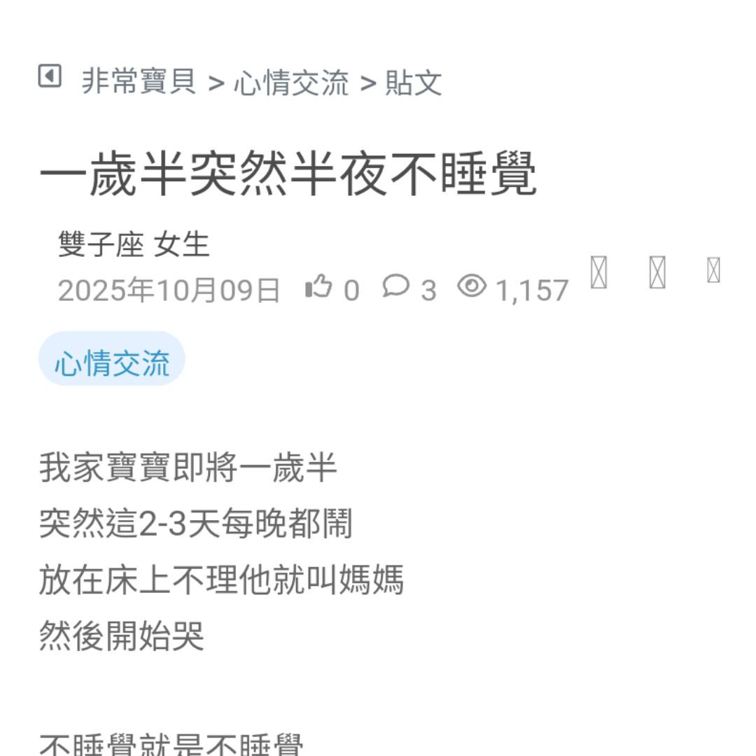 兒子1歲7個月多 最近一直頻繁夜醒 都固定時間起床 … 差不多3-5點左右 要媽媽抱抱 給他玩一陣子 每天都耗到快早上 😮💨😮💨 怎麼辦小baby會這樣持續下去到什麼時候 看更多