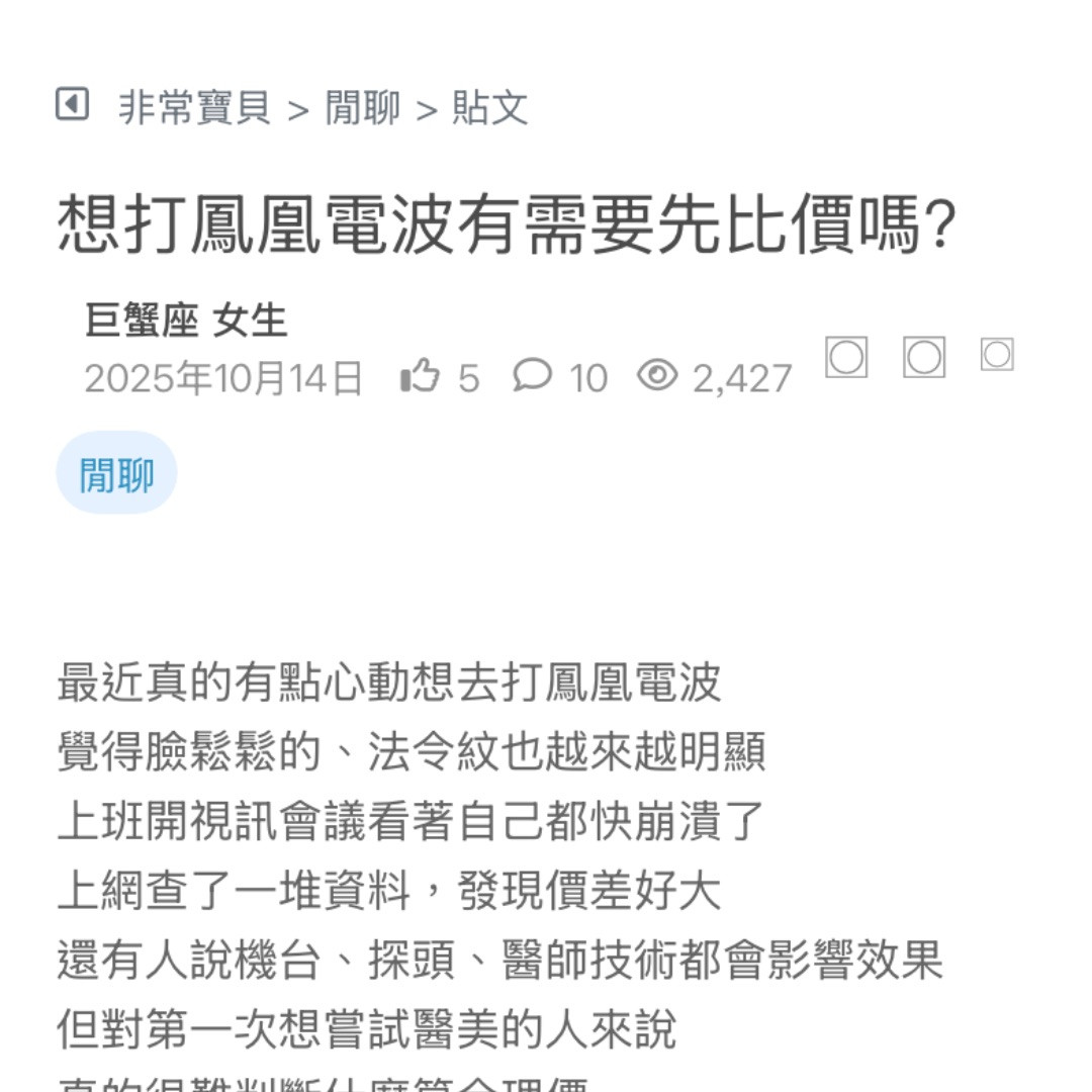 最近照鏡子真的越看越覺得臉鬆鬆的 法令紋跟下顎線那邊都不太明顯了 整個人看起來好沒精神 前幾天滑到有人推薦鳳凰電波 說拉提效果不錯,而且不用開刀,感覺蠻心...