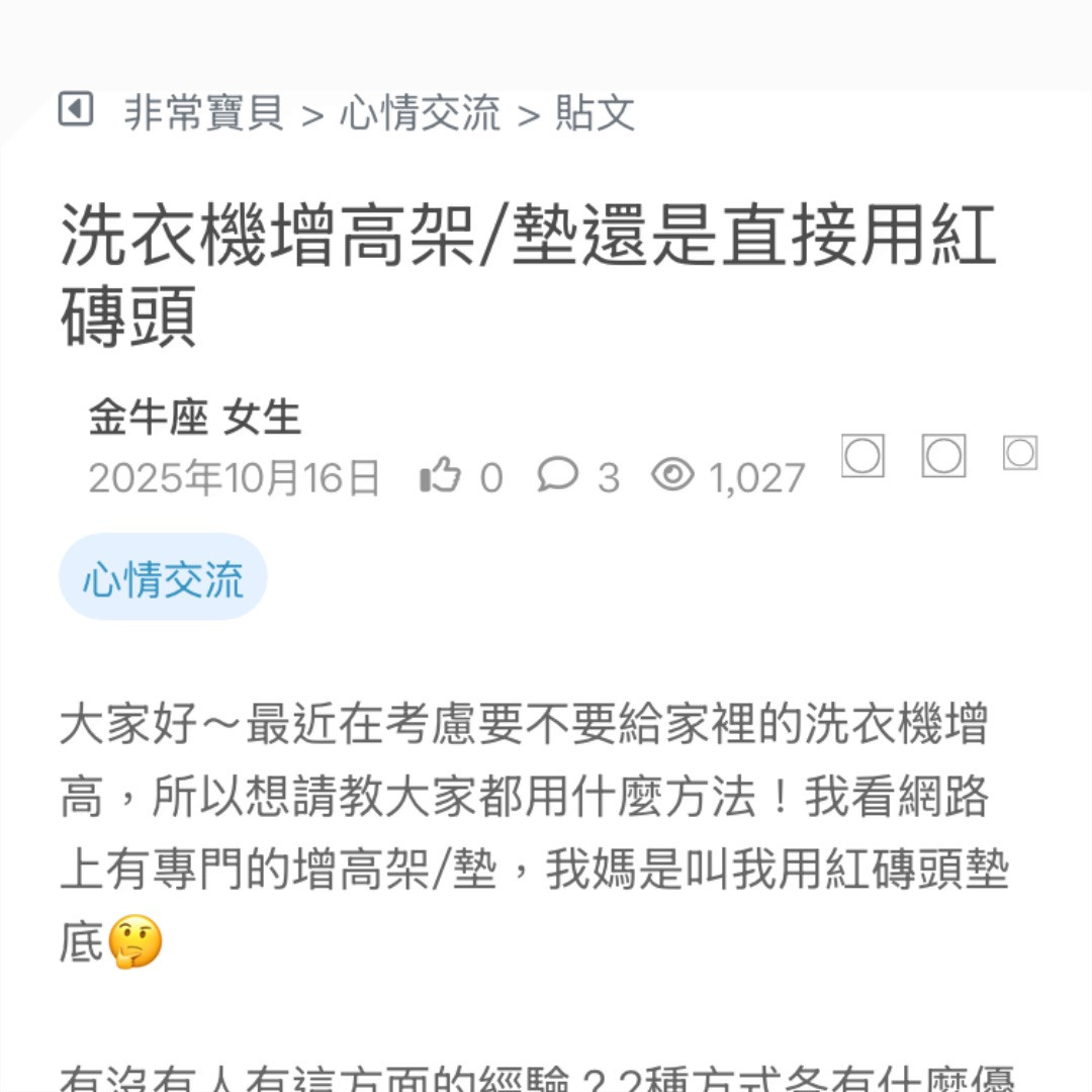 大家好~最近在考慮要不要給家裡的洗衣機增高,所以想請教大家都用什麼方法!我看網路上有專門的增高架/墊,我媽是叫我用紅磚頭墊底🤔