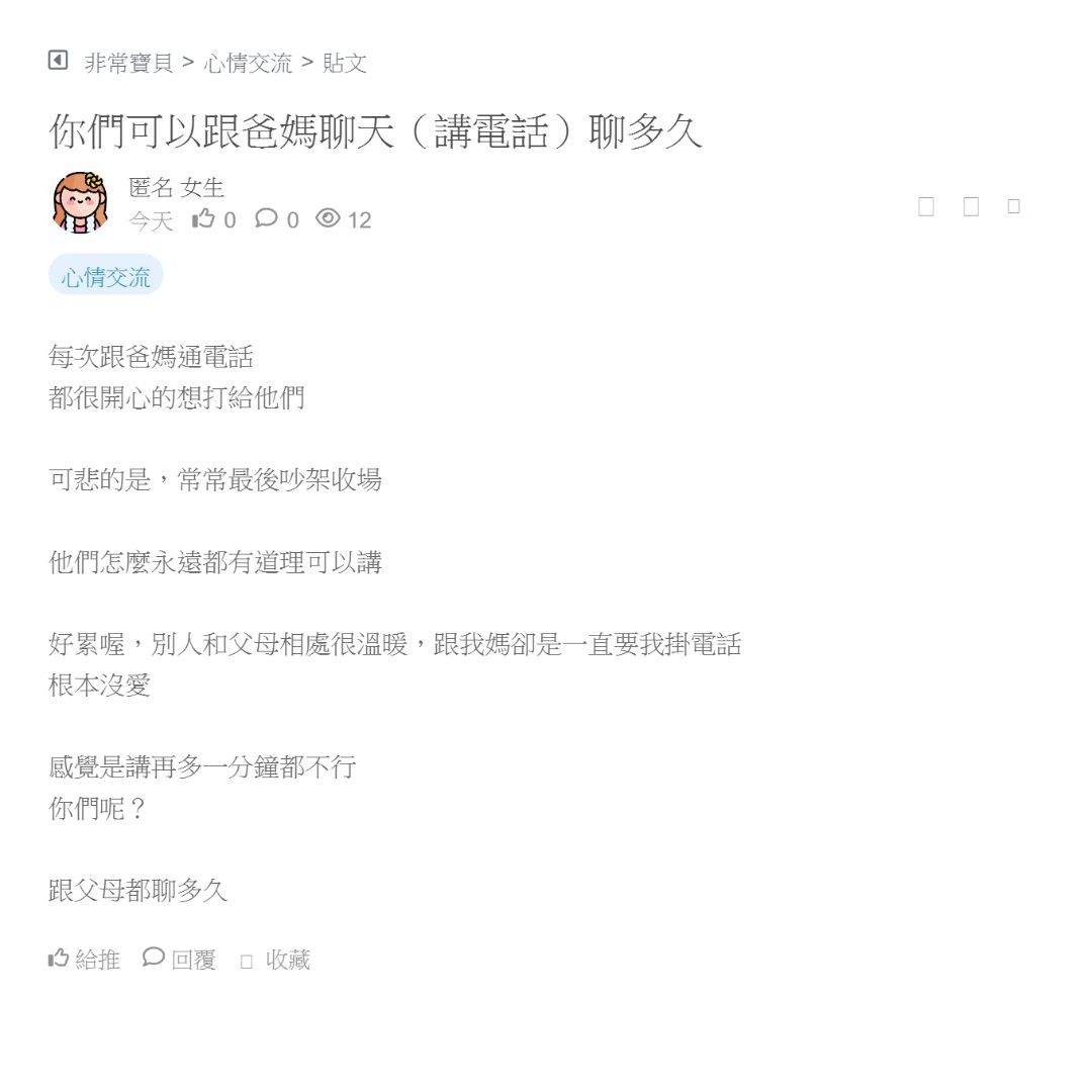 好累喔,別人和父母相處很溫暖,跟我媽卻是一直要我掛電話