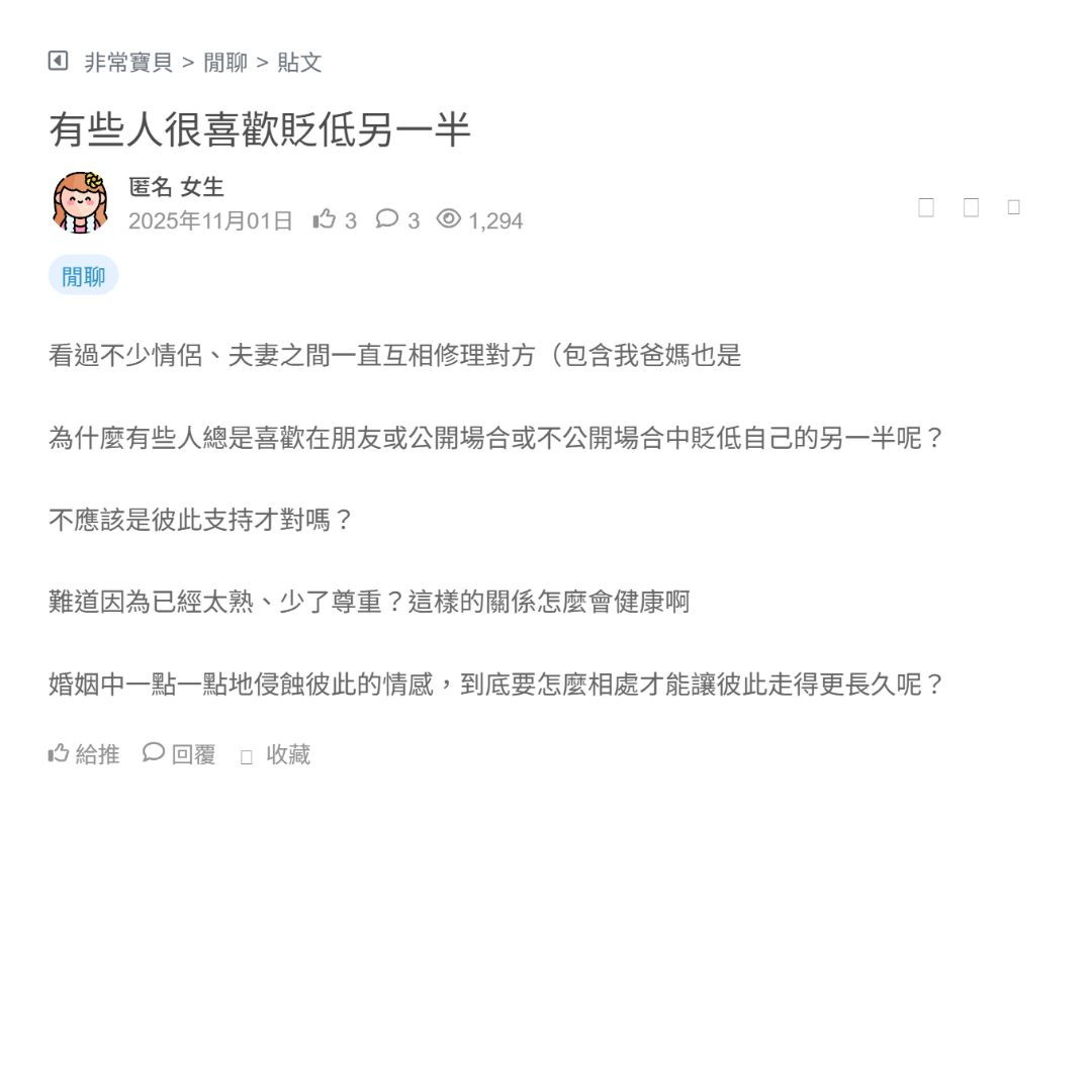 我知道可能想太多了 但越來越常在想 結婚到底只是兩個人的事,還是兩個家庭的事? 和男友感情很好,他也說會保護我、幫我擋在前面 可是每次聽到他媽在家裡碎念 講說「媳婦就要怎樣怎樣」或者拿鄰居的媳婦當標準 我心裡就有點毛... 有一次吃飯,他媽無意間說了句「結了婚總是要懂事一點、不要這麼任性」 我那時候笑笑的... 看更多