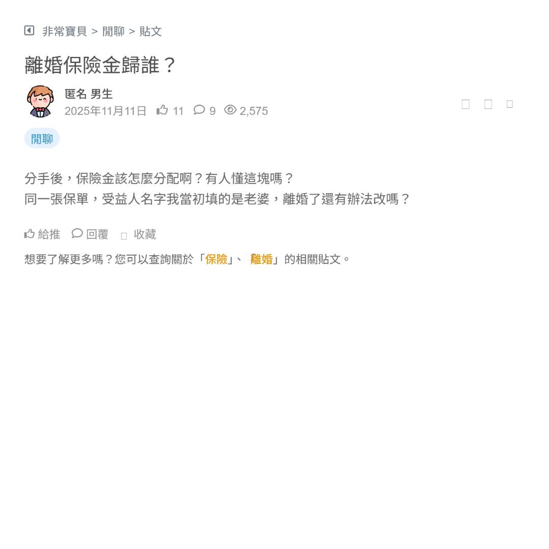我家人離婚後才發現保單受益人還是前妻 笑死