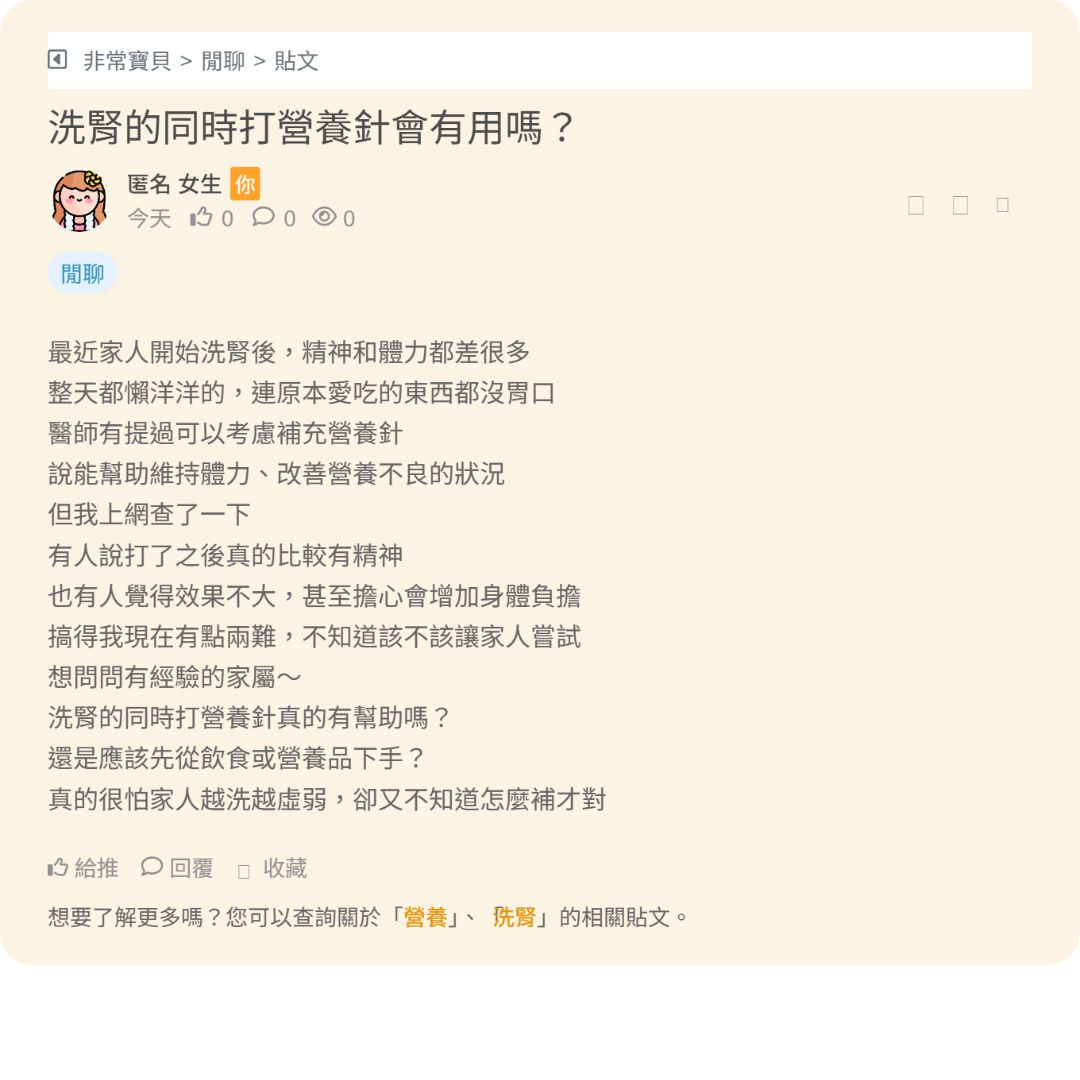 本身是一個想比較多的人 像最近家人固定在洗腎 但是被醫師建議 目前的一個身體指數不太好 讓我們考慮打營養針 乍聽之下感覺打營養針 是可以直接給身體帶來營養是...