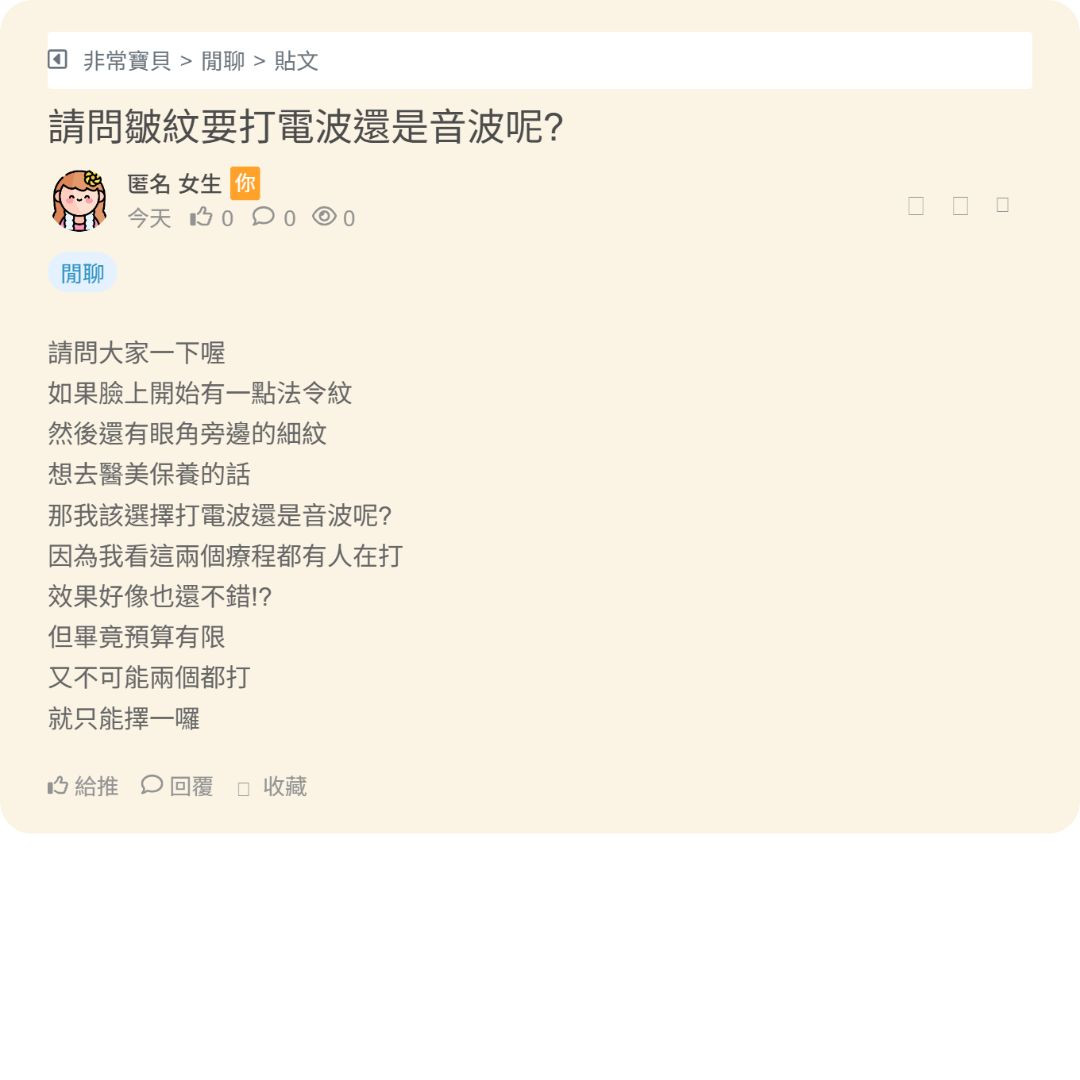 想知道如果平常就是 一個比較怕痛的人 那是適合去打音波嗎? 因為我不知道打音波 是不是真的會很痛 可是身邊有朋友去打過電波 他們就都說打電波很痛 那我想說那可能就不適合我吧 所以要打的話就只剩音波了? 看更多