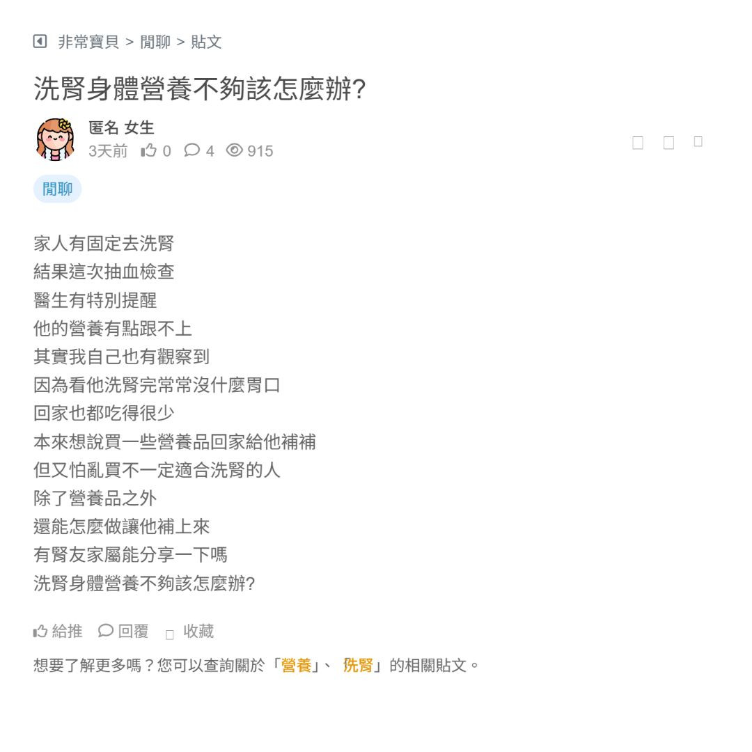 本身是一個想比較多的人 像最近家人固定在洗腎 但是被醫師建議 目前的一個身體指數不太好 讓我們考慮打營養針 乍聽之下感覺打營養針 是可以直接給身體帶來營養是...